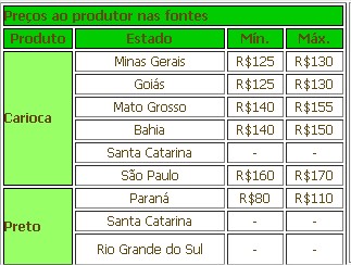 Feijão Carioca - Nesta madrugada a bolsinha ofertava os saldos da semana e a oferta foi de 8.000 sacas com venda de 3.000 sacas. As referências foram R$ 158/160 para o feijão nota 9, R$ 148/150 para o nota 8,5 e R$ 140 para o nota 8.