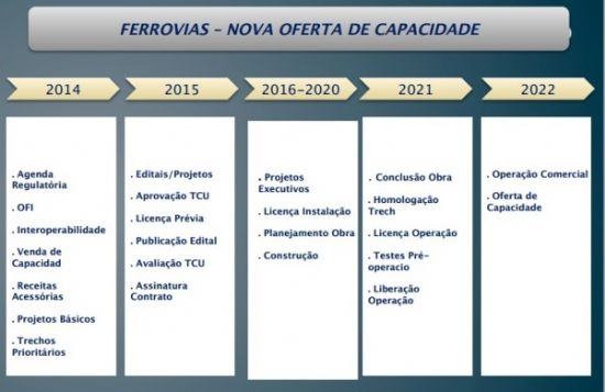 O presidente da Anut mostrou, em um cronograma, que o ano de 2014 deve ser apenas de estudos de viabilidade, definição dos projetos prioritários, realização de projetos básicos e venda da capacidade por meio de leilões. Já 2015 deve ser usado para elaboração dos editais, aprovação no Tribunal de Contas da União (TCU), publicação de licença prévia e assinatura de contratos.