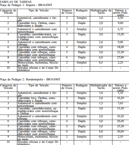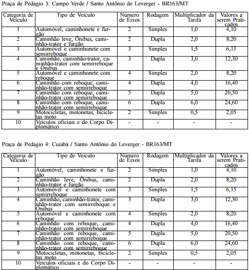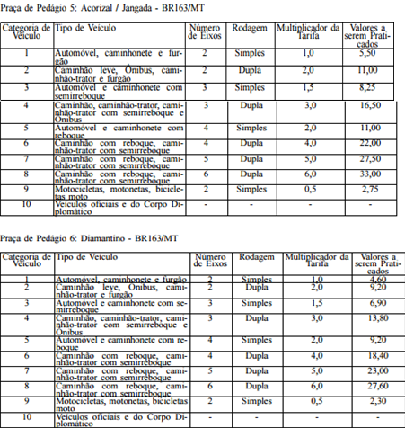 Segundo consta no Diário Oficial da União, a Praça 1 em Itiquira terá valor reajustado de R$ 4 para R$ 4,50; na Praça 2 em Rondonópolis de R$ 4,50 para R$ 5,10; na Praça 3 em Campo Verde/Santo Antônio do Leverger de R$ 3,70 para R$ 4,10.