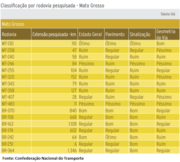Dos 4.731 quilômetros avaliados pela pesquisa em Mato Grosso 620 quilômetros tiveram classificação “ótima” para seu estado geral, 570 quilômetros “ruim” e 169 quilômetros “péssimo”. Enquanto, 2.190 quilômetros classificação "regular" e 1.182 quilômetros "bom".